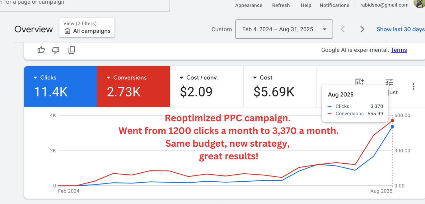 This client let me take control on February 28th of his paid advertising campaign. Without increasing the budget, I utilized a new, nuanced strategy he was able to see an instant spike in his traffic. The end result was tripling his traffic and leads.